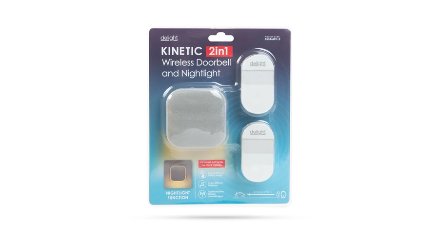 A Delight, elem nélküli csengők legújabb tagja, megújult dizájnnal és funkciókkal megérkezett! Kettő az egyben eszköz, amely használható hagyományos csengőként és fényszenzoros éjjeli fényként is. A vezeték nélküli csengő kapcsolója a dinamó elvén működik. A nyomógombos kapcsoló működtetéséhez nincs szükség semmilyen külső áramforrásra. A működéshez szükséges elektromos áramot a kapcsolóban található dinamó hozza létre. Az innovatív KINETIC - elem- és vezeték nélküli - technológiának köszönhetően nincs többé szükség elemre a termék működtetéséhez.